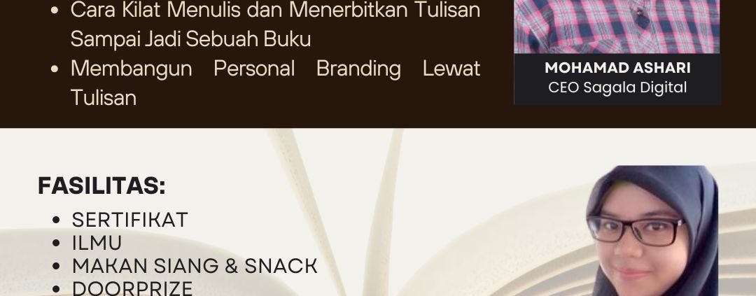 Personal Branding merupakan hal esensial untuk menonjolkan diri kita di era millenial ini. Berbagai macam cara orang ingin dikenal sebagai identitas tertentu, salah satunya melalui tulisan. Bagaimana cara agar dikenal melalui tulisan? Apakah buku di era digital masih relevan untuk mengenalkan diri? Bagaimana agar dapat menulis hingga menghasilkan sebuah buku? Semua pertanyaan tersebut akan dibahas secara mendalam oleh Narasumber Mohamad Ashari (CEO Sagala Digital) dan Sabrina Ayunda (CEO Start-Up, Senior Editor, Public Speaking Coach) melalui event WORKSHOP MENULIS BATCH 1: